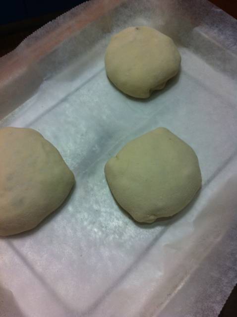 - Dividir la massa en 3 troços, amassar-los i afegir-hi un poc de farina (de sèmola millor)